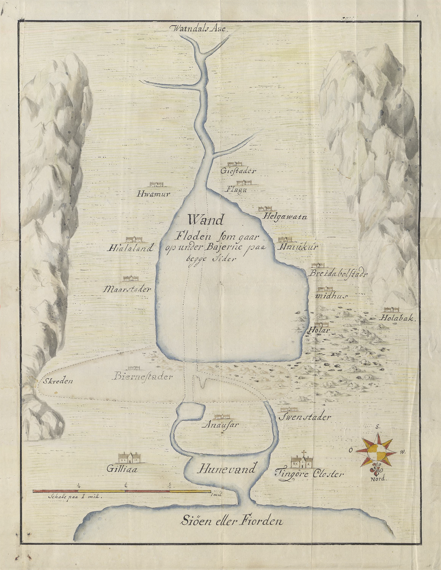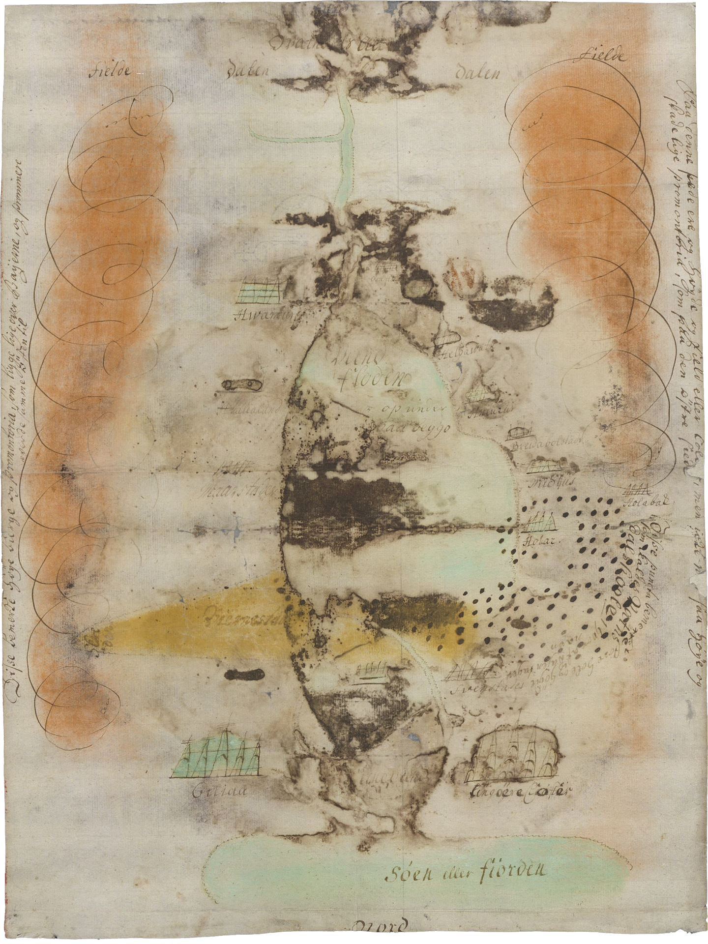 A sketch of the landslide in Vatnsdalur in Húnavatnssýsla on the night of October 8, 1720, or rather its consequences. The sketch was stapled into the letter book of Peter Raben, the parish clerk, for the year 1722 and is damaged by moisture like the letter book itself. This is, as far as can be seen, the sketch that Jóhann Gottrup, the commissioner and sheriff of Húnavatnssýsla, sent to the county clerk Raben in a letter on September 22, 1721.
