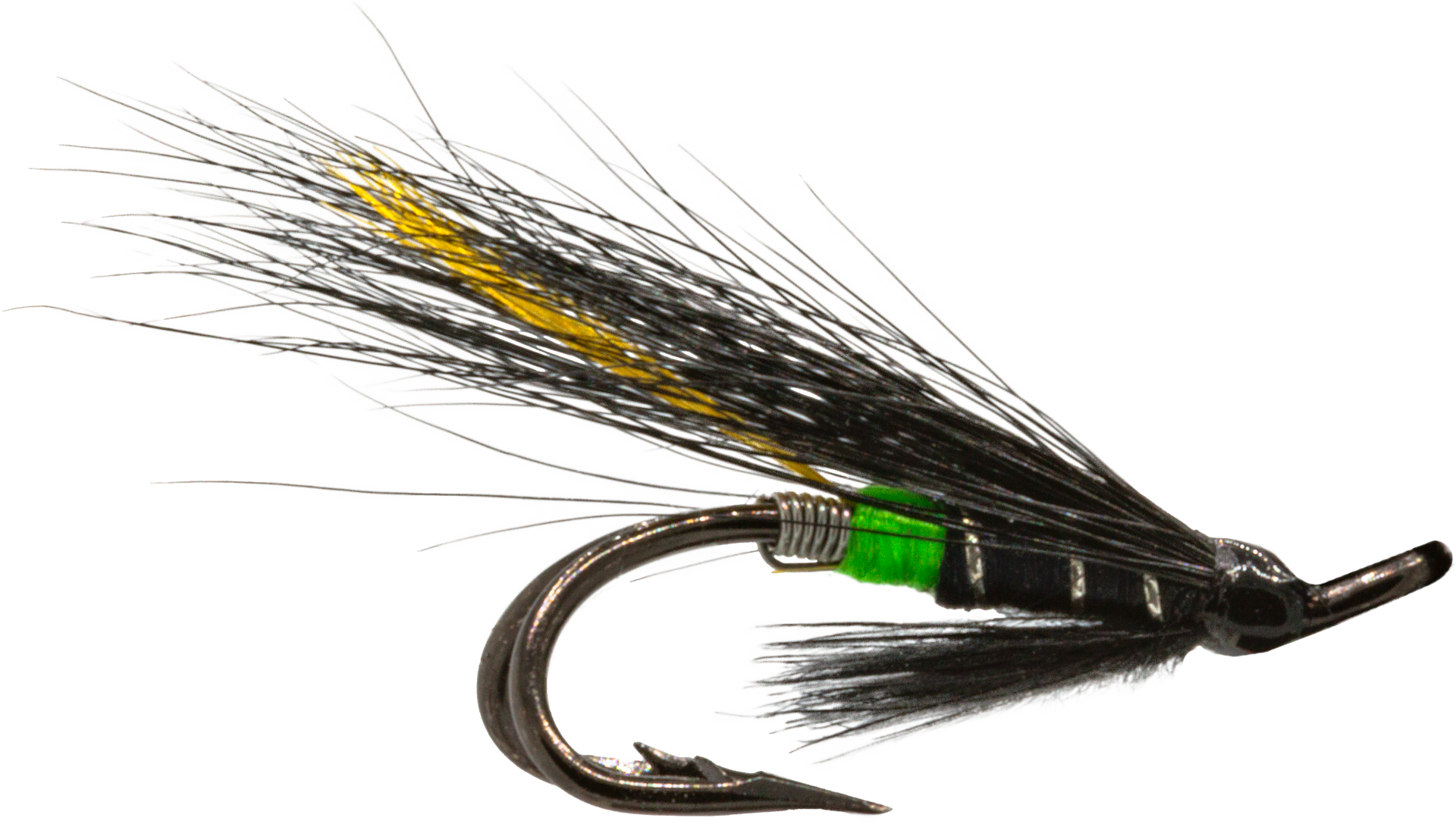 Originally developed in Eastern Canada, the Black Bear Green Butt is a classic Atlantic salmon fly, simply known as the Green Butt. Long established across Northern Europe and North America, its dark wing and fluorescent green butt create strong contrast, making it highly effective in various water conditions.