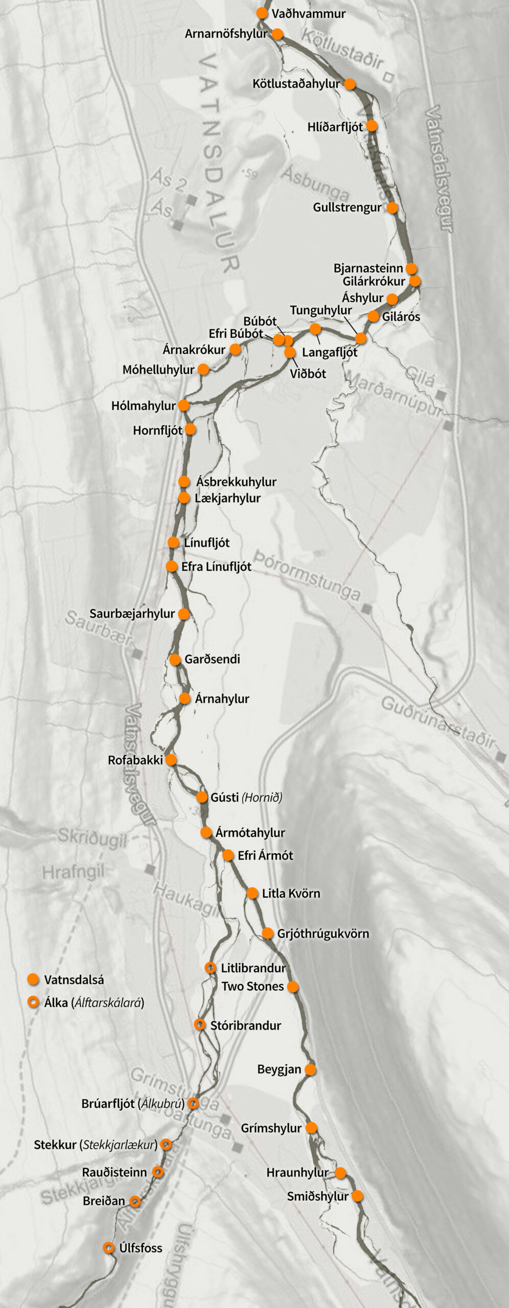 Vatnsdalsá is a 74 km spring-fed river originating from Haukagilsheiði and Grímstunguheiði, flowing into Vatnsdalur.