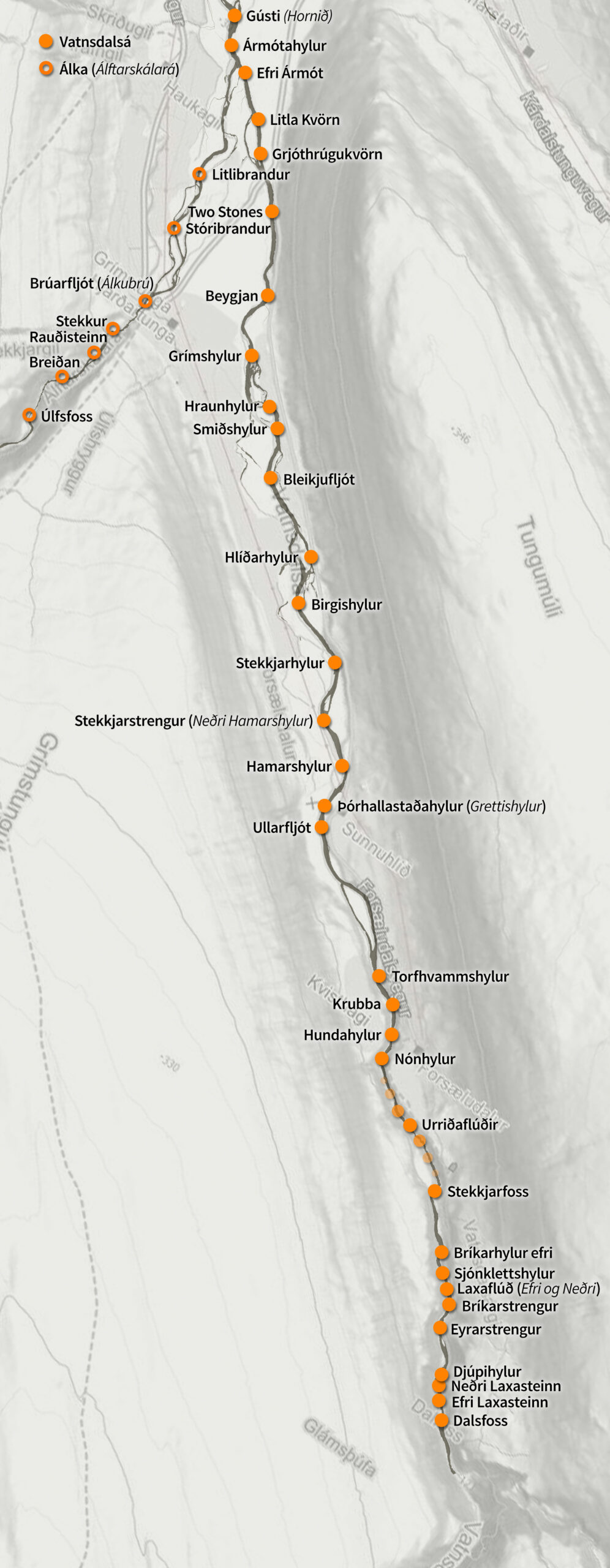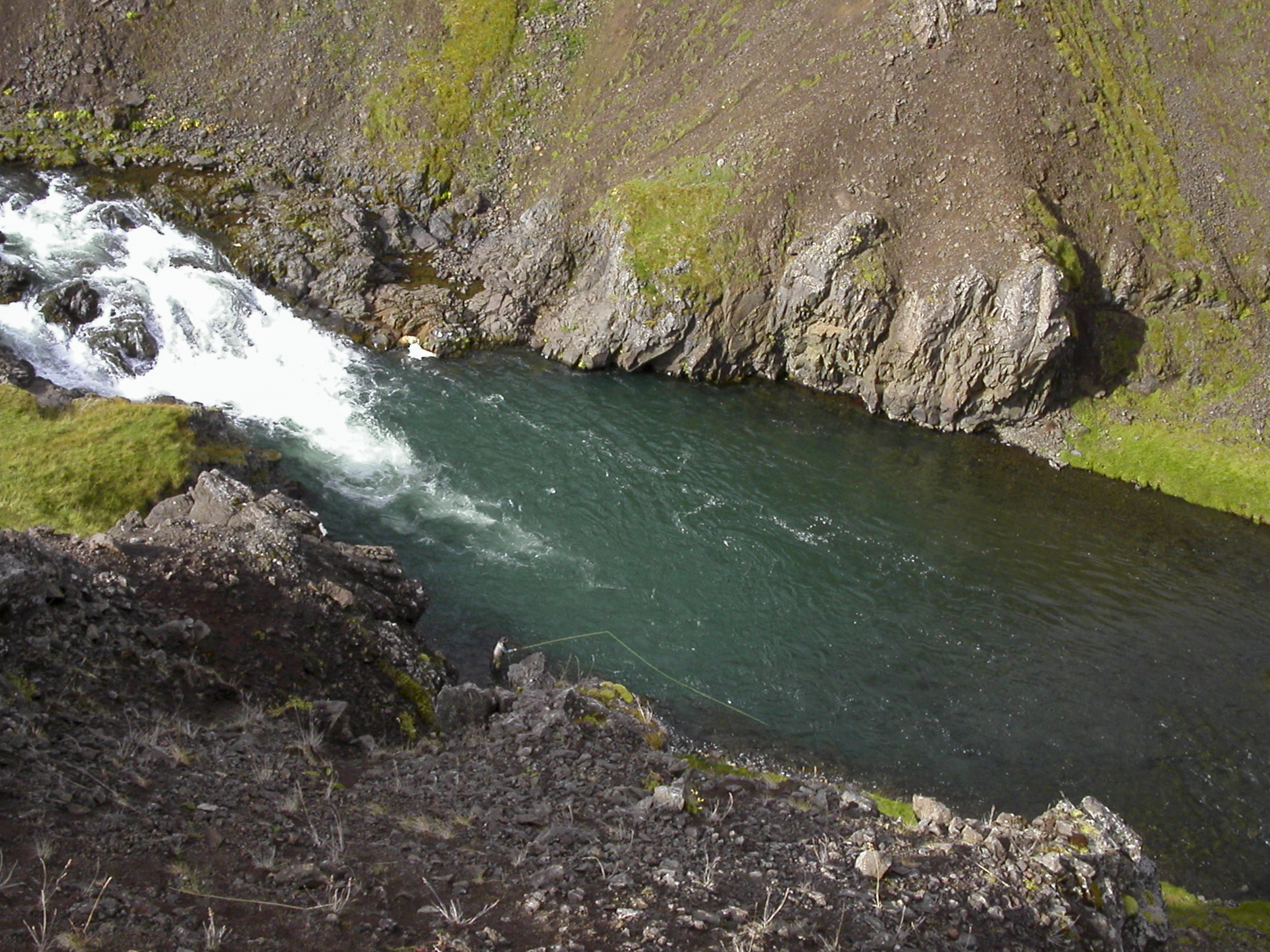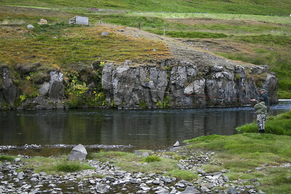 It’s advisable to start uppermost at the corner called Gílárkrókur, for there often some new run salmon is to be found. Virtual the first strike point is straight off an old weatherworn fence pole on the east waterside. This spot is about in the middle of the pool, about 10-15 meters above a big rock the water hits, the rock this pool has its name from. The next striking spot is to be found by this rock, both sides to it, particularly to the far current. The third spot is far down, by a little creek which runs down the east hillside. Here it is advisable to wade carefully into the middle of the pool, for the salmon lies at the east side of the river. Begin about 12-15 meters above a current which forms at the east side and fish towards the creek.