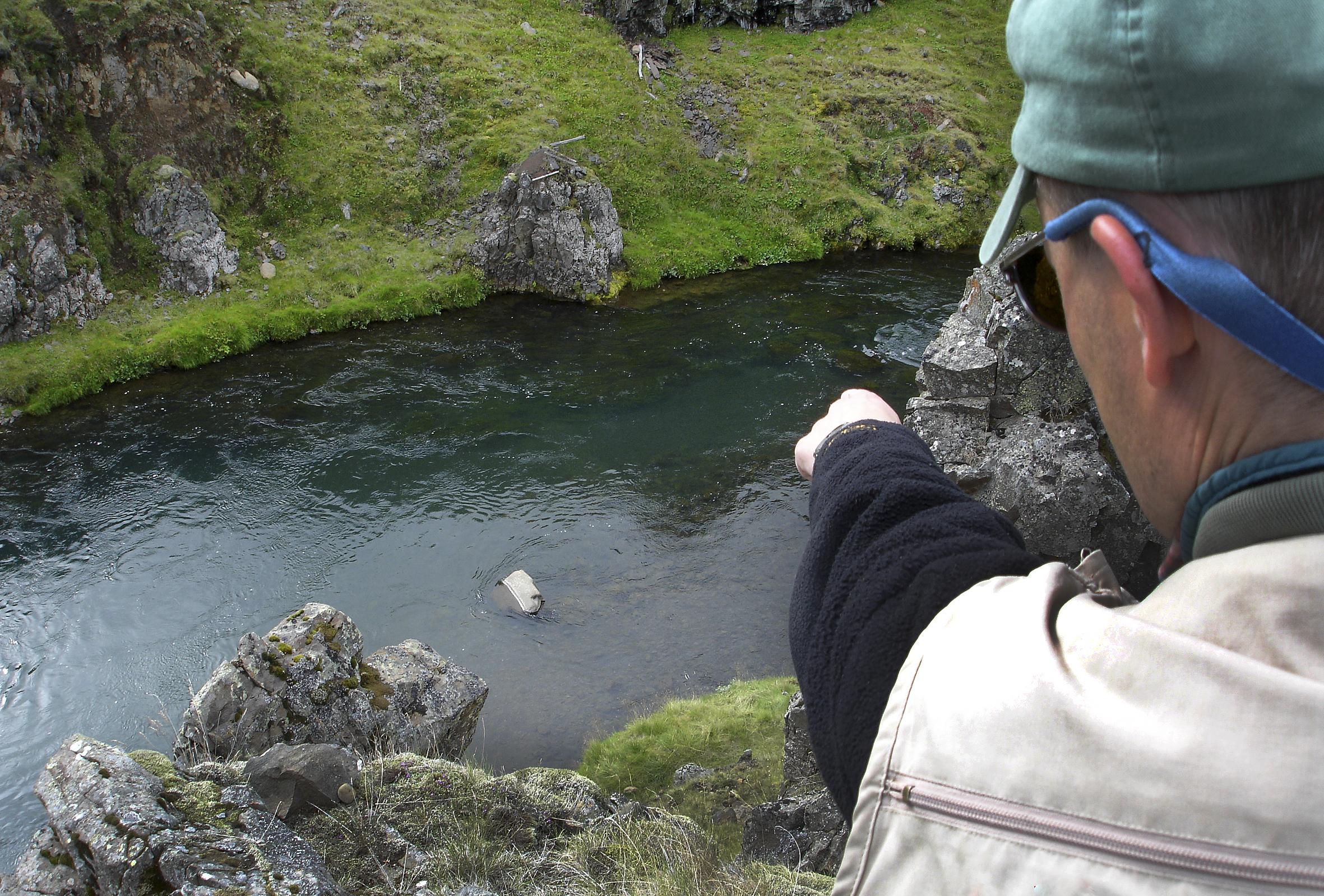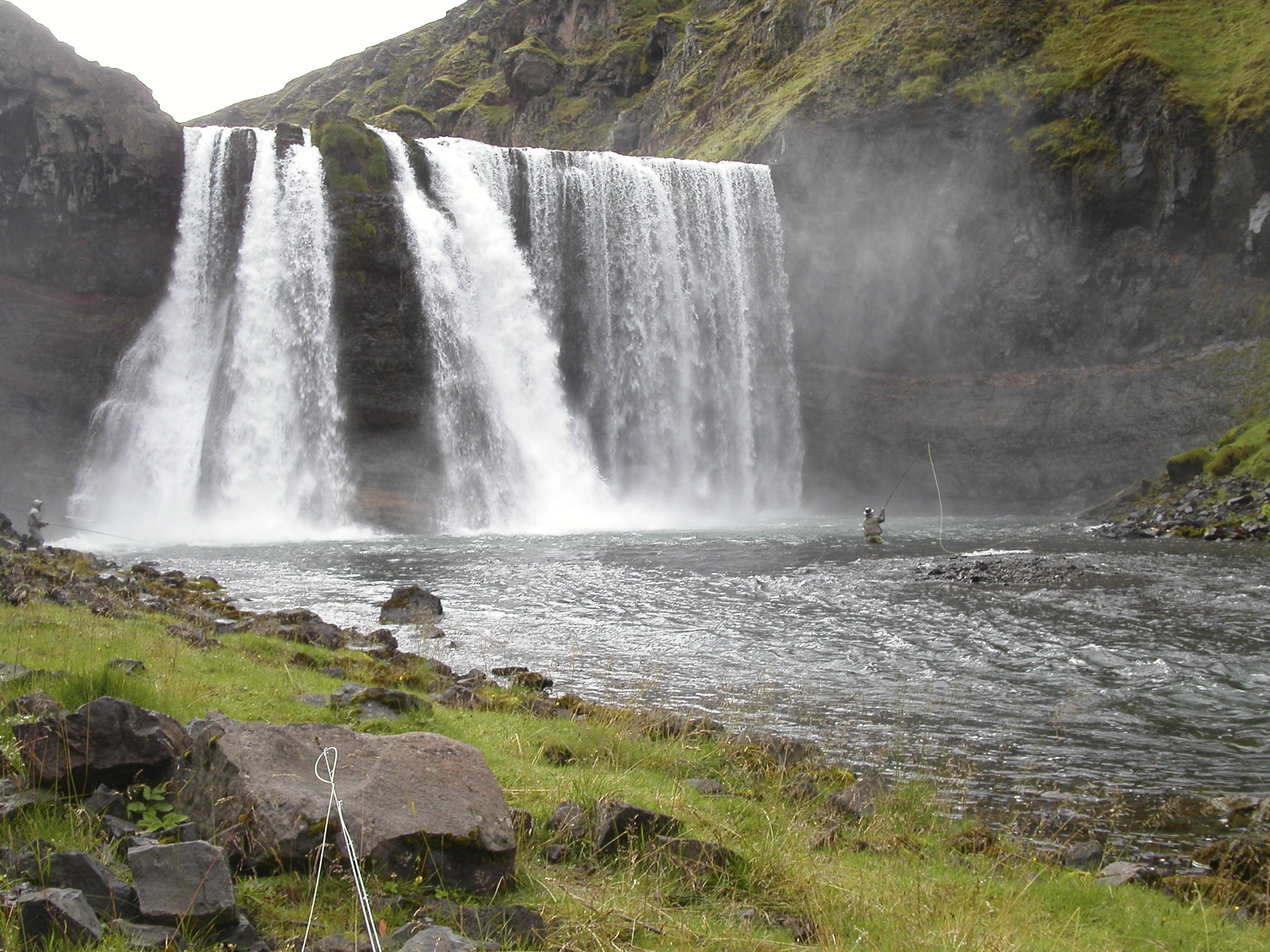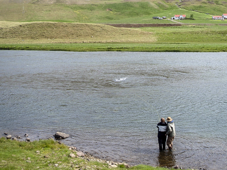 It’s advisable to start uppermost at the corner called Gílárkrókur, for there often some new run salmon is to be found. Virtual the first strike point is straight off an old weatherworn fence pole on the east waterside. This spot is about in the middle of the pool, about 10-15 meters above a big rock the water hits, the rock this pool has its name from. The next striking spot is to be found by this rock, both sides to it, particularly to the far current. The third spot is far down, by a little creek which runs down the east hillside. Here it is advisable to wade carefully into the middle of the pool, for the salmon lies at the east side of the river. Begin about 12-15 meters above a current which forms at the east side and fish towards the creek.