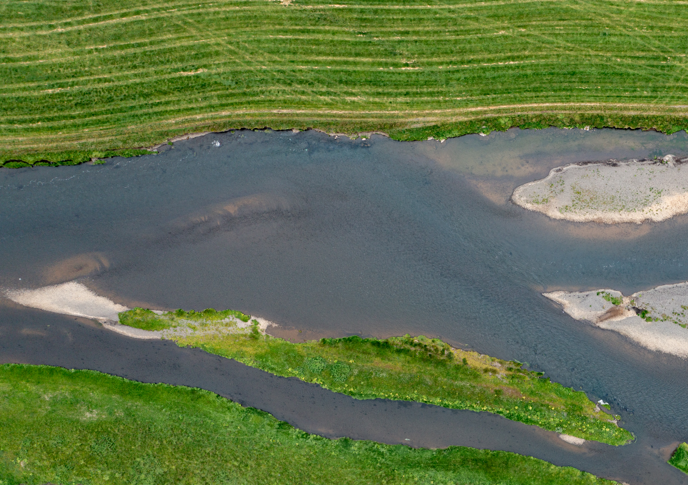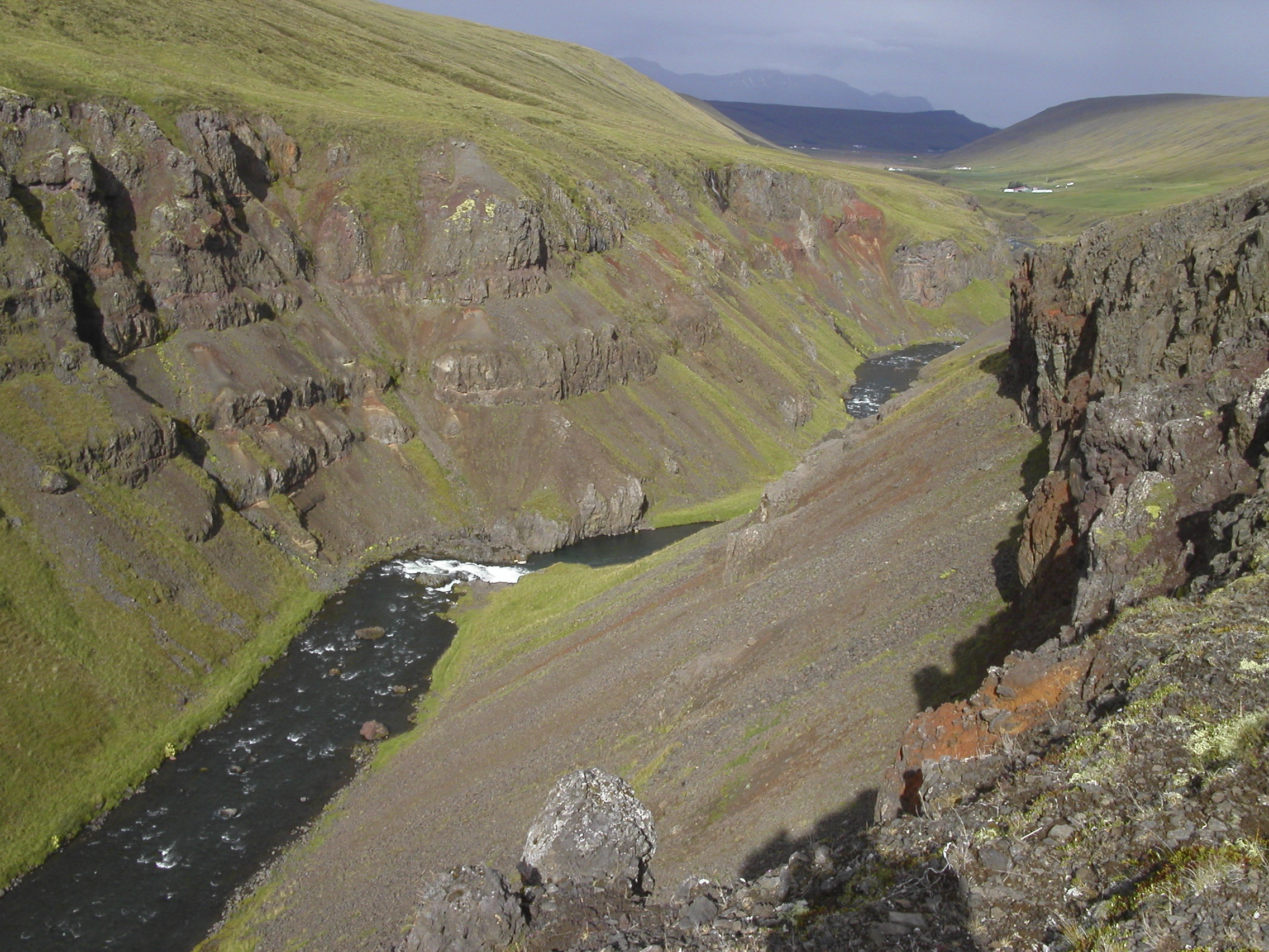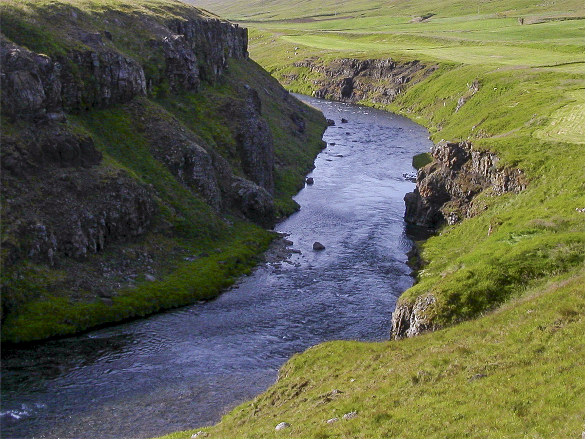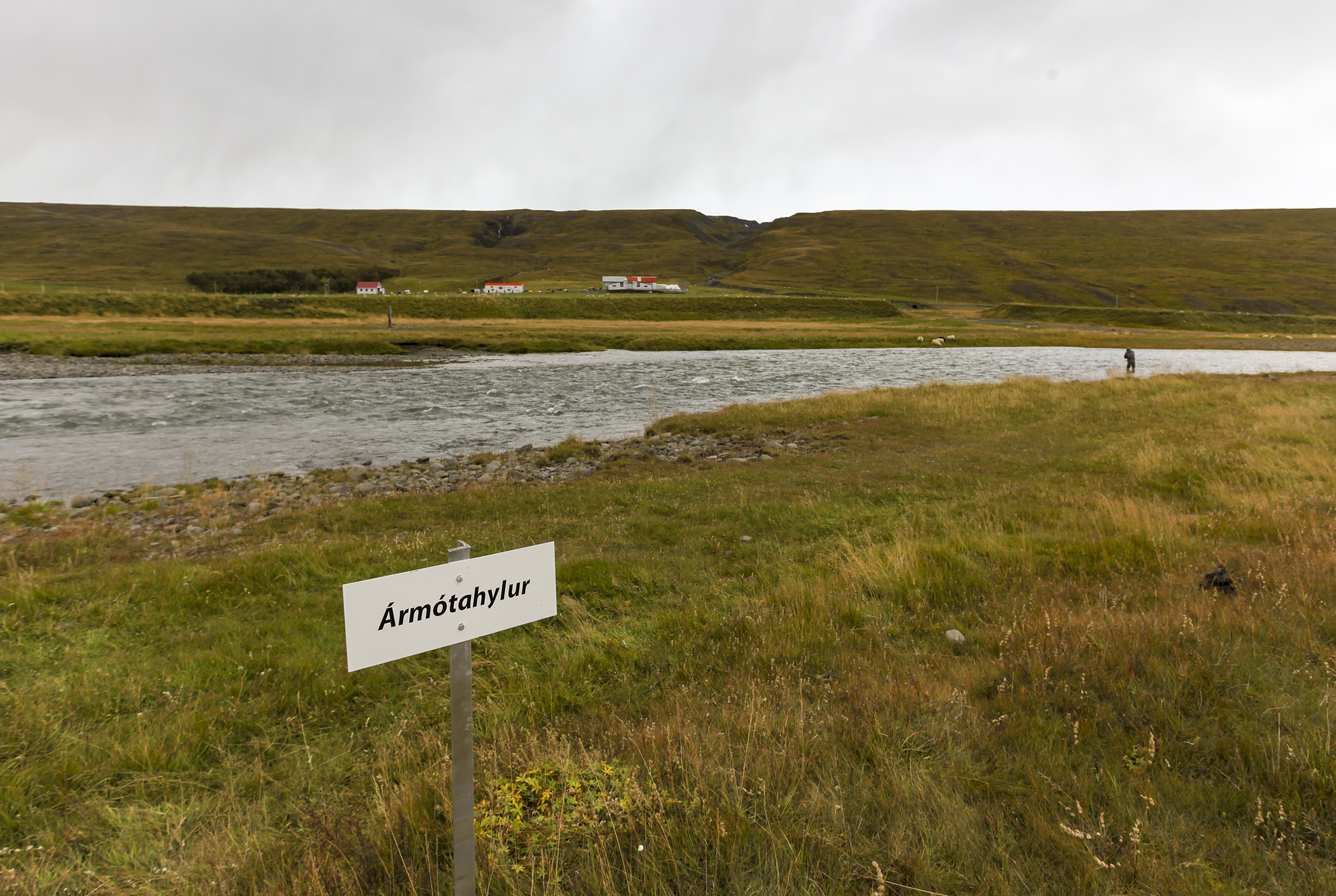 Þórhöllustaðahylur is below the farm Sunnuhlíð, sometimes named Grettishylur. Here it’s important not to bring the car too close to the river, because this pool, like many others in the river, is very vulnerable to any disturbance. Start fishing by wading out into the riffle above the pool and cast towards the edge of the cliff or a little to its side, where the river is deepest. The pool should be fished all the way down to the riffle which is quite far below it. The place to stop is where a telephone line has been shoveled in and crosses the rivers underground, and is not hard to find. This is quite a good fishing pool and in late summer it is almost certain to yield a fish if treated in the right way.